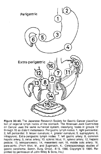 In raportul Centrului National al Cancerului de la Tokio (1972) s-a definitivat individualizarea si numerotarea a 16 grupuri ganglionare ce trebuiesc extirpate de chirurg in tratamentul chirurgical radical al cancerului gastric.