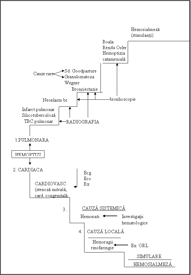 In practica medicala, clinic si paraclinic, diagnosticul hemoptiziei poate urma un algoritm pe care il prezentam in fig. 1 din anexa cursului.