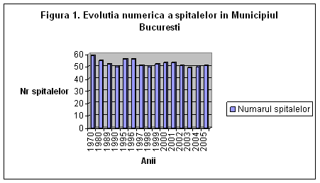 In figura de mai jos (figura 1) este evidentiata evolutia numerica a spitalelor in Municipiul Bucuresti. Se inregistreaza o evolutie oscilanta, dar nesemnificativa a acestora, in comparatie cu celelalte cazuri analizate. Aceasta situatie se datoreaza faptului ca spitalele raman in proprietate publica, functionand pe baza unor bugete anuale.