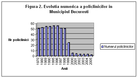 Numarul policlinicilor, reprezentat in figura 2, cunoaste o evolutie destul de interesanta in Municipiul Bucuresti, pe parcursul perioadei analizate.