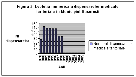 Urmatorul grafic (figura 3) evidentiaza evolutia numerica a dispensarelor in Municipiul Bucuresti. Acestea figureaza, cu unele oscilatii, doar in prima parte a perioadei analizate (culminand in anul 1980 ca valoare maxima), deoarece erau unitatile sanitare cele mai larg raspandite, avand un rol principal in furnizarea serviciilor medicale primare. Pana in anul 1998, populatia era arondata unui dispensar teritorial, in functie de locul de munca sau de rezidenta.