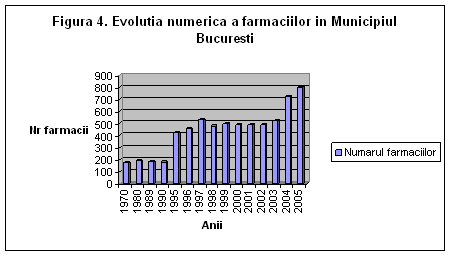 Evolutia numerica a farmaciilor in Municipiul Bucuresti este prezentata in figura 4. Din grafic reiese ca valorile cele mai mici se regasesc in intervalul 1970 - 1990, deoarece masurile luate de economisire a resurselor banesti si asa reduse, au dus la servicii medicale oferite in conditii precare si cu o medicatie insuficienta. In perioada 1995 - 2003, insa, situatia se schimba destul de mult, numarul farmaciilor dublandu-se, fapt datorat reformei sanitare, prin care au fost alocate noi fonduri financiare. Numarul cel mai mare al farmaciilor apare in ultima parte a intervalului analizat (2004 -2005), moment in care acestea au cunoscut o dezvoltare rapida. Motivatia este, ca si in cazul farmacistilor, ca aceste unitati au fost printre primele servicii de sanatate care s-au privatizat si au putut sa-si dezvolte propriile afaceri private.