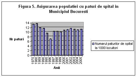 In graficul de mai jos (figura 5)este evidentiat numarul paturilor de spital la 1000 locuitori, in Municipiul Bucuresti. Se inregistreaza o evolutie oscilanta a acestuia, cu valorile cele mai mari in prima parte a intervalului (1970 - 1990), deoarece, in perioada regimului comunist, era adoptata o politica de tratare a bolilor, si nu de prevenire a acestora. Incepand cu anul 1996 (cand se inregistreaza si valoarea cea mai mica), numarul paturilor de spital se reduce putin, scaderea fiind justificata de desfiintarea unor spitale.