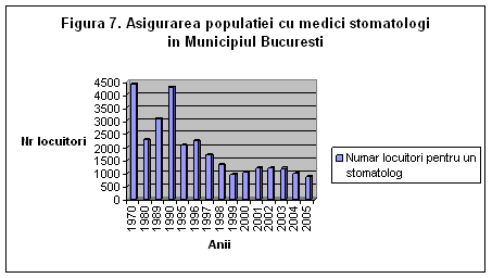 In graficul de mai jos (figura 7) este evidentiata asigurarea populatiei cu medici stomatologi in Municipiul Bucuresti. Ca si in cazul precedent, se observa o evolutie oscilanta a numarului de locuitori ce revine unui medic stomatolog pe toata perioada analizata.