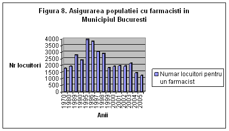 Cea mai mare valoare este inregistrata in anul 1995, perioada in care reforma sanitara in acest domeniu a fost mult intarziata, confruntandu-se cu obstacole si in anii urmatori, datorate lipsei fondurilor financiare.Valorile cele mai scazute ale numarului de locuitori ce revine unui farmacist apar la inceputul si la sfarsitul intervalului. In grafic se observa ca cea mai mica valoare se inregistreaza in anul 2005. Motivatia este aceea ca farmacistii au fost printre primii profesionisti in sanatate care s-au privatizat si care au putut sa-si dezvolte propriile afaceri private.
