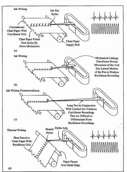 Inregistrarea semnalelor biomedicale pe suport de hartie are la baza galvanometrul cu magnet permanent si bobina mobila (GMPBM). De bobina mobila parcursa de semnalul amplificat se ataseaza un stilou, ansamblul aflandu-se in campul unui magnet permanent puternic. Interactiunea celor doua campuri da nastere miscarii echipamentului mobil pe axa Y. Miscarea orizontala a hartiei este stabilita cu un servomecanism electric. Aceste dispozitive se mai numesc si oscilografe inregistratoare. Ca sisteme de scriere pot fi contactul direct, termal, stiloul sau jetul cu cerneala si cel optic (Figura 1). Sistemele care folosesc stiloul (contact direct si termal) au inertie mecanica, ceea ce duce la o banda de frecventa maxima de 100200Hz. Cele cu jet de cerneala si optice sunt mult mai rapide (10003000Hz). Varianta optica foloseste lumina colimata, o oglinda in locul penitei si hartie fotosensibila sau, mai modern, hartie fotografica derulata in fata unui tub catodic.