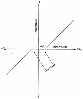 Inregistratoarele X-Y utilizeaza doua servomecanisme conectate la acelasi ansamblu de scriere, conectate la 90, fiecare pentru cate o axa de coordonate. Hartia, de calitate obisnuita, este fixa. Ambele axe pot fi comandate si cu semnal extern. In acest caz, daca se doreste imprimarea lui Y(t), semnalul pentru axa X trebuie sa fie o rampa crescatoare. Datorita inertiei mecanice a ansamblului de scriere, semnalul de intrare trebuie sa depaseasca o anumita valoare, ceea ce produce o anumita zona 'moarta' (Figura 3). De obicei, ea reprezinta 0,050,1% din intreaga scala si are ca efect distorsionarea accentuata a semnalelor cu amplitudine in domeniul 'mort'. Solutia este o preamplificare marita a semnalului de intrare.