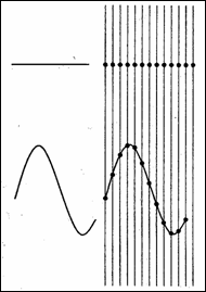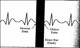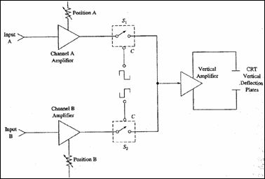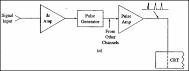 Cele n canale necesare aplicatiilor medicale se realizeaza prin tehnici de comutare ale fasciculului electronic si prin folosirea amplificatoarelor de deflexie tip poarta. Un chopper bicanal este aratat in Figura 5. Comutatoarele electronice sunt comandate in antifaza cu o viteza de 2100 KHz, ceea ce permite vizualizarea la un moment dat a unui singur semnal de intrare. In cadrul amplificatoarelor-poarta axa verticala a ecranului este scanat cu o frecventa in domeniul 1525 KHz iar axa orizontala se misca de la stanga la dreapta cu o viteza de 25 mm/s. Rezultatul este ca fiecare cursa verticala succesiva scaneaza tubul catodic in puncte usor diferite, ceea ce produce pe ecran un rastru asemanator baleiajului din TV. Fasciculul electronic este in general blancat (stins). El va fi vizibil doar la momente specifice, date de un generator de impulsuri comandat in tensiune. Frecventa impulsurilor este comandata de catre semnalul de intrare (Figura 6). Cand acesta este zero pe ecran apar puncte luminoase situate aproximativ in mijlocul ecranului si care se deplaseaza cu 25 mm/s. Nivelul de c.c. la intrare deplaseaza pe verticala linia de puncte, in sensul si cu distanta aferente amplitudinii semnalului. Un semnal de intrare alternativ este redat corect (aspect continuu) datorita frecventei de repetitie de 1525 KHz pe verticala.