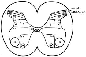 Aferentele periferice care preiau informatia de la nociceptori au, dupa cum am amintit, corpul neuronal situat in ganglionii spinali, atasati radacinilor rahidiene posterioare, neuronul de ordinul I Proiectiile dendritice ale acestor neuroni ajung la nivelul nevraxului (maduva spinarii) in cornul posterior. In substanta cenusie care formeaza coarnele anterior si posterior, unite prin partea intermediara, Rexed (1956) descrie o anumita topografie sau citoarhitectonica. In aceasta topografie sunt identificate 10 zone sau straturi. La nivelul fiecarui strat apare o concentrare de neuroni cu functii asemanatoare. In cornul posterior sunt evidentiate 6 straturi sau lamine (fig. 2.1).