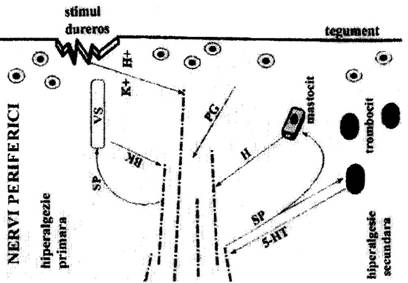 Existenta unui proces complex de modulare periferica declansata de actiunea unui stimul dureros este sugerata inca din 1942 de Lewis, care descrie fenomenul de 'triplu raspuns' al tegumentului in urma aparitiei unui stimul dureros. Autorul descrie inrosirea tegumentului, prezenta edemului si a unei sensibilitati exagerate la acest nivel ('rubor, tumor, dolor, calor'), urmate de extinderea fenomenelor si la tegumentele invecinate, care nu au fost sub actiunea directa a stimulului dureros initial. Deci, alaturi de actiunea directa a stimulului nociceptiv este sugerata si aparitia unor fenomene de tip inflamator, confirmate de studiile ulterioare (fig. 2.3).