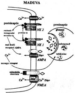 Aminoacizii excitatori, glutamatul si aspartatul, actioneaza asupra unor receptori specifici de tipul N-metil-D-aspartat (NMDA). Activarea acestor receptori initiaza o serie de procese intracelulare de fosforilare, cu aparitia a numeroase substante printre care si prostaglandinele (PG) cu rol in fenomenele de crestere a sensibilitatii neuronale si de recrutare neuronala. Activarea receptorilor NMDA stimuleaza si activitatea sintetazei oxidului nitric (NOS) consecinta fiind aparitia locala a oxidului nitric (NO). Atat PG cat si NO favorizeaza alaturi de fenomenele de sensibilizare si recrutare neuronala eliberarea suplimentara a aminoacizilor excitatori la nivelul neuronilor din comul posterior medular.