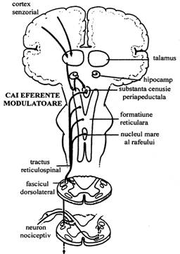 Alaturi de fenomenele inhibitorii segmentare in transmisia informatiei nociceptive un loc aparte il reprezinta fenomenele de inhibitie supraspinala La nivel spinal, la neuronii ascendenti cat si la neuronii intercalari din cornul posterior, ajung terminatile nervoase ale unor tractusuri cunoscute sub numele de caile descendente inhibitorii Fibrele nervoase care intra in componenta acestor cai inhibitorii isi au originea, in principal, la nivelul unor neuroni din substanta cenusie periapeductala, la nivelul formatiunii reticulate a trunchiului cerebral si in nucleul mare al rafeului. Aceste cai isi exercita actiunea asupra neuronilor amintiti atat presinaptic cat si postsinaptic prin intermediul unor neurotransmitatori specifici.