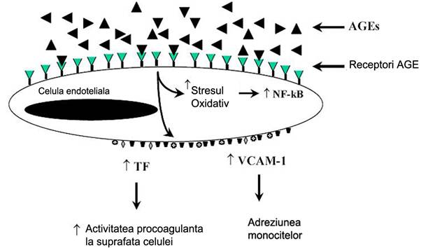 Interactia AGE cu RAGE de pe celulele endoteliale duce la inducerea stresului oxidativ si in consecinta, a factorului de transcriptie NF-kB [Yan et al., 1994; Wautier et al., 1994] si VCAM-1 (figura 9) [Schmidt et al., 1995].