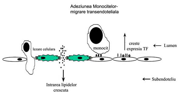 Printre evenimentele initiale ale aterogenezei se numara disfunctia endoteliala si depunerea si retentia particulelor lipoproteice aterogenice bogate in apolipoproteina B in spatiul subendotelial [Simionescu et al., 1986; Williams & Tabas, 1995]. Aceasta depunere promoveaza inflamatia locala, caracterizata de eliberarea factorilor de semnalizare solubili, incluzand chemokine [Gerszten et al., 1999] si de expresia moleculelor de adeziune celulara endoteliala, ca VCAM-1, ICAM-1 si P-slectina. Aceste molecule recruteaza leucocitelor mononucleare, in special monocite, in peretele arterial. Avand acces la spatiul subendotelial, monocitele recrutate se diferentiaza in macrofage, proces controlat de interactiile monocitelor cu matricea extracelulara si citokinele din subendoteliu.