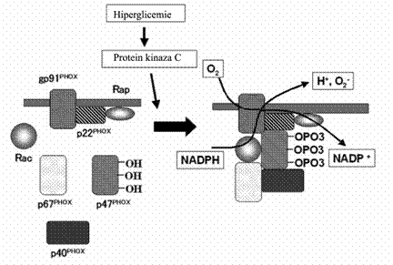 Pentru activarea enzimei mai sunt necesare inca doua proteine de masa moleculara mica Rac si Rap. In celulele neactivate, Rac este localizata in citoplasma intr-un complex dimeric cu Rho-GDI (inhibitorul disocieri guanidinei), iar Rap este localizata in membrana. In timpul activarii, Rac se leaga la GTP (guanozin - trifosfat) si migreaza la membrana alaturi de complexul citosolic al NADPH oxidazei. Glucoza crescuta activeaza NADPH oxidaza in celulele vasculare [Dragomir et al., 2004; Manea et al., 2005].