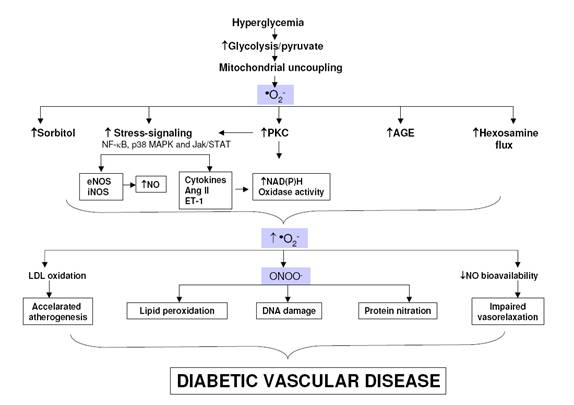 Expunerea prelungita la hiperglicemie este cunoscuta ca factor primar in patogeneza complicatiilor diabetice [Laakso 1999; Grundy et al., 1999]. Hiperglicemia induce un numar mare de alterari in tesutul vascular care promoveaza ateroscleroza accelerata. In prezent au fost descrise trei mecanisme majore care sunt implicate in modificarile patologice observate in vasculatura persoanelor diabetice si a animalelor diabetice: 1) glicarea ne-enzimatica, 2) activarea protein kinazei C (PKC) si 3) stresul oxidativ. Important este ca aceste mecanisme nu sunt independente. De exemplu, stresul oxidativ indus de hiperglicemie promoveaza formarea produsilor finali de glicare avansata (AGE) si acivarea PKC [Nishikawa et al., 2000]