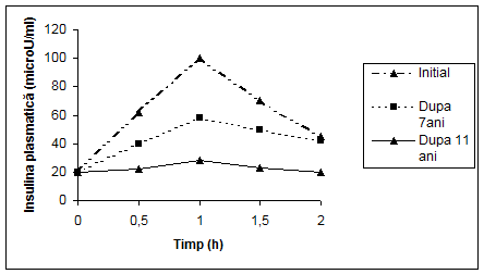 Figura 2 - Raspunsul insulinic normal, comparativ cu cel inregistrat la un pacient cu diabet evoluand de mai multi ani