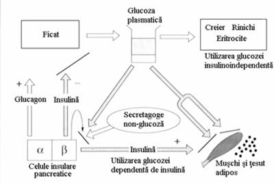 Homeostazia glicemica este mentinuta, in ciuda unui aport si al unui consum foarte variabil al glucozei, prin interventia insulinei, singurul hormon hipoglicemiant si a altor hormoni hiperglicemianti:glucagonul, catecolaminele, cortizolul, hormonul de crestere (tabelul 4)