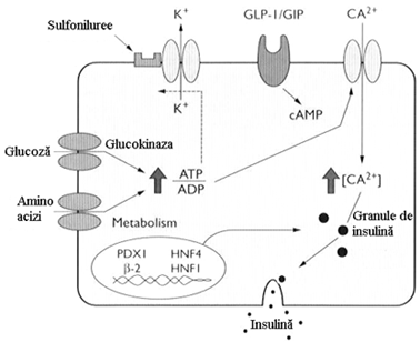 Celulele beta capteaza glucoza si aminoacizii cu ajutorul unor transportori specifici, de la nivelul membranei celulare, cum ar fi GLUT- 2 transportorii de glucoza. Acesti transportori sunt exprimati numai la nivelul celulei beta pancreatice si a celulei hepatice. Odata patrunsa in celula glucoza este fosforilata de glucokinaza, apoi este catabolizata, ducand la cresterea raportului ATP/ADP in celula, care activeaza canalele de K -ATP dependente. Celula se depolarizeaza prin iesirea K din celula, are loc un influx de Ca2 , care duce la eliberarea insulinei din granulele secretorii. Nivelul expresiei mai multor molecule implicate in detectarea glucozei, incluzand transportorii de glucoza GLUT 2 si dezvoltarea celulei beta sunt controlate de mai multi factori de transcriptie nucleara. Cei mai studiati dintre acestia sunt HNF-1 alfa, HNF-1beta, HNF-4 alfa si PDX-1( IPF-1). DZ tip MODY poate rezulta din defecte genetice la oricare dintre acesti factori de transcriptie sau ca defect la nivelul glucokinazei.
