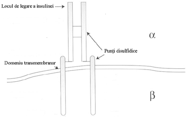 Receptorul insulinic este necesar pentru a media actiunea insulinei. Gena receptorului insulinic este localizata pe bratul scut al cromozomului 19. In forma lui matura este un homodimer, compus din 2 lanturi a si 2 lanturi b a b ). Subunitatile a sunt complet extracelular si sunt legate intre ele prin punti disulfidice. Subunitatile b traverseaza membrana si sunt legate de lanturile a prin punti disulfidice si interactiuni noncovalente. Portiunea intra-celulara a lanturilor b contine o proteina specifica, numita tirozinkinaza.