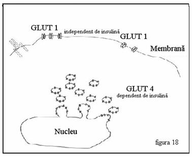 In conditii bazale transportul glucozei prin membrana plasmatica se efectueaza insulino-independent, catalizat de GLUT 1. In majoritatea tesu-turilor aceasta este singura cale pentru captarea glucozei. In tesuturile ce prezinta insulino-dependenta in captarea glucozei exista un pool secundar al transportorilor de glucoza, care in conditii bazale este localizat intracelular. Acesti transportori de glucoza sunt localizati in organite intracelulare specializate. (Figura 18)