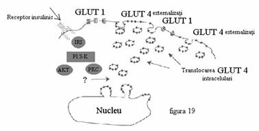 In momentul in care insulinemia creste, apare translocarea GLUT 4. Insulina elibereaza GLUT 4 din vezicule, imbogatind suprafata celulara in GLUT care mediaza capatarea glucozei. (Figura 19)