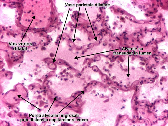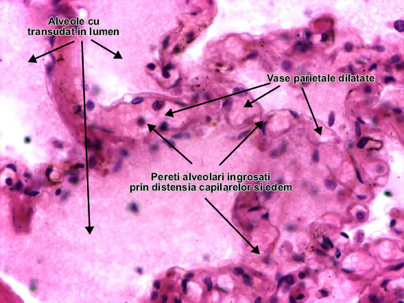 Peretii alveolari sunt ingrosati prin distensia capilarelor alveolare. In alveole : lumenul este partial sau total ocupat de transudat, care apare ca un precipitat palid-eozinofil, fin granular. Se pot produce microhemoragii prin ruperea capilarelor sau prin cresterea permeabilitatii acestora. (Hematoxilina-eozina, ob. x20)