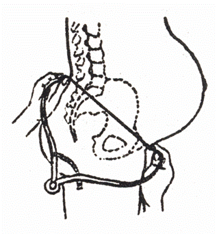 De la eminenta ilio-pectinee la simfiza sacro-iliaca de partea opusa