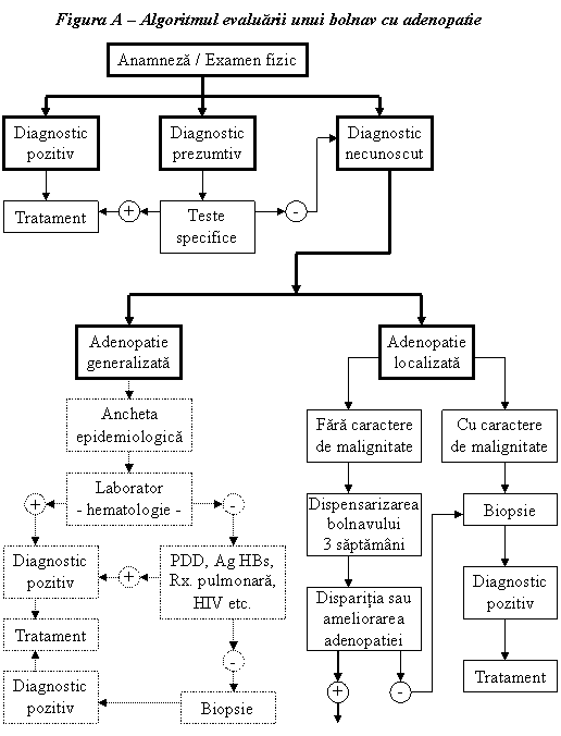 Au fost imaginate scheme care furnizeaza medicului cadrul general pentru evaluarea cat mai exacta a unei adenopatii (vezi fig. A). Cheia acestei evaluari ramane anamneza si examenul clinic. In cele mai numeroase cazuri se poate stabili inca din aceasta etapa un diagnostic pozitiv, ceea ce permite trecerea directa la tratamentul specific.