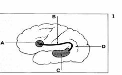 Leziunea in aria Broca, emisfer dominant (A) produce afazie expresiva; leziunea in substanta alba subcorticala care intrerupe fasciculul arcuat produce jargon afazie (B); leziune a in aria Wernicke produce afazie receptiva (C), leziune in girusul angular produce afazia amnestica cu agrafie si alexie.