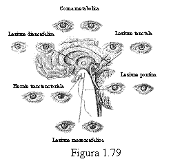 Ø 'skew-deviation'- deviatia oblica a globilor oculari, cu un ochi care priveste sus si inauntru iar celalalt in jos si inafara se observa cel mai frecvent in leziunile pontine dar si in cele bulbare sau mezencefalice.
