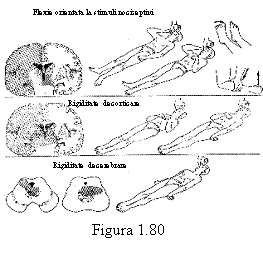 Ø rigiditatea de decorticare: membrele superioare in flexie iar cele inferioare in extensie arata o leziune la capatul rostral al mezencefalului
