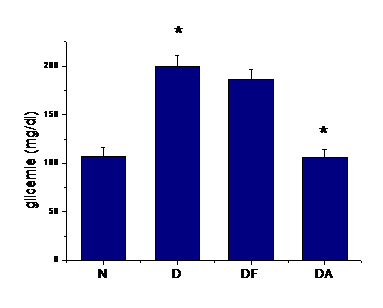 La sfarsitul perioadei studiu, sorecilor li s-a recoltat sangele si au fost sacrificati. Sangele recoltat a fost centrifugat si am izolat serul. Glicemia a fost determinata in serul fiecarui animal din cele patru grupe experimentale cu ajutorul unui kit (Dialab) de determinare a glicemiei. Dupa cum putem observa in figura V.1. glicemia grupului de soareci injectati cu streptozotocina (D) este de doua ori mai mare decat a grupului de soareci normali. Tratamentul soarecilor diabetici cu fenofibrat (DF) nu are efct asupra glicemiei serice. In contrast, tratamentul cu aspirina, timp de o luna, induce o reducere semnificativa a glicemiei serice soarecilor diabetici (DA).