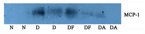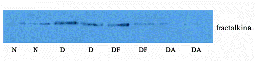 Aortele animalelor din cele patru grupe diferite au fost mai intai omogenizate cu ajutorul unui Douncer. Probelor omogenizate li s-a determinat concentratia proteica si apoi a urmat determinarea expresiei proteice a celor doua chemokine prin tehnica de Western Blot. Rezultatele obtinute (figura V.2, A si B) arata ca expresia MCP-1 si fractalkinei sunt crecute in grupul soarecilor diabetici (D) comparativ cu grupul normal (N). In cazul soarecilor diabetici tratati cu aspirina expresia celor doua chemokine este redusa la nivelul expresiei in grupul control. Soarecii tratati cu fenofibrat au redus de asemena expresia MCP-1 si fractalkinei, insa efectul nu a fost la fel de mare ca in cazul soarecilor tratati cu aspirina.