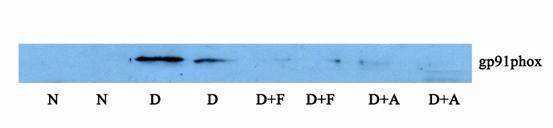 Detectia proteica a subunitatii gp91phox a NADPH oxidazei s-a facut in omogenatele aortice din care s-a determinat si expresia fractalkinei si MCP-1. Rezultatele obtinute arata ca expresia subunitatii gp91phox este crescuta in tesuturile animalelor diabetice (D). Tratamentul soarecilor diabetici cu aspirina si fenofibrat reduce expresia acestei proteine la nivelul expresiei din tesuturile animalelor normale (N, figura V.4.).