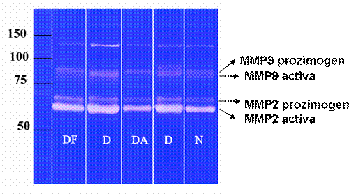 Evidentierea formelor latente (prozimogen) si active ale metaloproteazelor matriceale MMP-2 sau MMP-9 se face prin zimografie [Galis ZS, 1994]. Serurile animalelor (colectate la diferiti timpi) au fost omogenizate in tampon de liza rece (10 mmol/L tampon fosfat/150 mmol/L NaCl cu 1% Triton X-100, 0.1% SDS, 0.5% deoxicolat de sodiu si 0.2% azida de sodiu) au fost migrate in gel de poliacrilamida 10% cu 0.1 % SDS copolimerizata cu gelatina (1mg/ml). In prealabil s-a determinat concentratia de proteina serica prin metoda Bredford (Biorad). Probele au fost reluate in tampon de solubilizare nereducator si care nu contine EDTA (acesta fiind un inhibitor al MMP) si nu au fost denaturate termic inainte de aplicarea pe gel. Dupa terminarea migrarii electroforetice, s-au efectuat doua spalari timp de 30 minute cu 2,5% Triton X-100, urmate de doua spalari timp de 20 minute in apa distilata. Dupa spalari, gelul a fost incubat la 37 C timp de 18h in tampon ce contine 50 mmol/L Tris-HCl, pH 7.4, 0.15 mol/L NaCl, 10 mmol/L CaCl2 (pentru activarea MMP), 1 mmol/L PMSF. In final, gelul a fost colorat intr-o solutie de 0.2 % Coomassie Blue R-250 in 50 % metanol si decolorat intr-un amestec metanol:acid acetic:apa (25:10:65 %). Benzile de liza s-au evidentiat ca benzi albe pe fond albastru si au fost densitometrate cu ajutorul programului TotalLab TL100 iar rezultatele au fost prelucrate statistic.