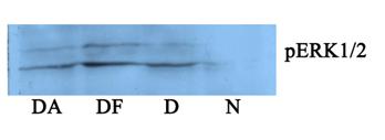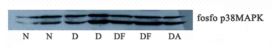 In dorinta de a determina caile de semnalizare implicate in expresia crescuta a chemokinelor MCP-1 si fractalkina si a MMP-2 si -9 la soarecii diabetici, am urmarit expresia MAPKs ERK1/2 si p38MAPK in omogenatele aortice de la animale provenind din fiecare grupa experimentala. Rezultatele preliminare arata ca expresia fosfo ERK1/2 este crescuta la animalele diabetice (D) comparativ cu cele normale (N, figura V.6. A), continuand sa ramana crescuta si la animalele diabetice tratate cu aspirina (DA) sau cu fenofibrat (DF). Acest rezultat sugereaza ca fosforilarea ERK1/2 ar putea fi implicata in expresia crescuta a chemokinelor in diabet, dar cele doua medicamente reduc expresia MCP-1 si fractalkinei, actionand pe alta cale de semnalizare.