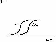 Fie 2 medicamente A si B . Presupunem ca A produce efect si ca B nu produce efect oricat am creste doza ( nu prezinta afinitate ) . Daca dupa administrarea B , administram din nou A , obtinem un efect sumat A+B ( B a deplasat curba lui A la dreapta → in prezenta lui B sunt necesare doze mai mari de A pentru a obtine acelasi efect ) . Deci B scade potenta lui A ;B se fixeaza si el pe receptori , dar nu are efect farmacologic .