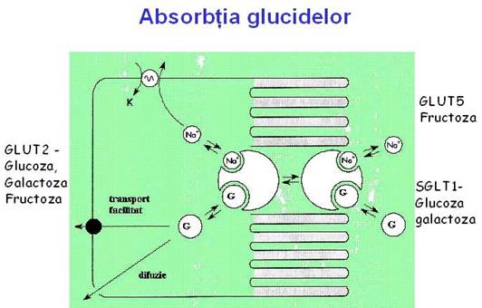 Absorbtia monozaharidelor, respectiv a glucozei, galactozei si fructozei precum si a unor pentoze implica doua mecanisme: transportul activ contragradient si transportul facilitat.