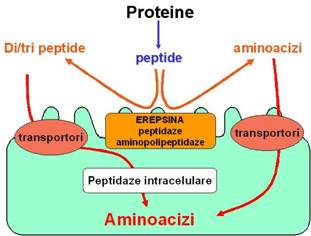 O parte dintre di- si tripeptidaze pot fi transportate activ in enterocite, unde sunt supuse actiunii hidrolitice a peptidazelor intracelulare.