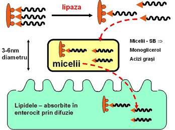 La nivelul microvililor enterocitelor, lipidele se desfac din structura micelelor si trec in enterocit cu ajutorul unor carrier-i specifici. Sarurile biliare se desfac din structura micelelor si raman in lumenul intestinal pentru a forma noi micele. In prezenta lor se absorb 97% din lipide, pe cand in absenta lor, se atinge un procent de numai 50 - 60%.