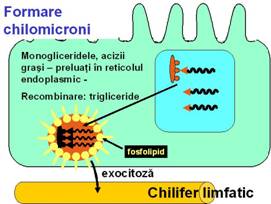 Trigliceridele si cea mai mare parte a colesterolului esterificat formeaza impreuna cu fosfolipidele si niste proteine hidrosolubile specifice (apo-proteine) complexe denumite chilomicroni. Chilomicronii sunt eliberati pe la polul bazal enterocitelor prin exocitoza si trec in limfa. Datorita marii cantitati de de chilomicroni din limfaticele intestinale, acestea se mai numesc si vase chilifere, iar limfa - chil. Din limfa, chilomicronii trec in sange, uinde persista aproximativ 6 ore.