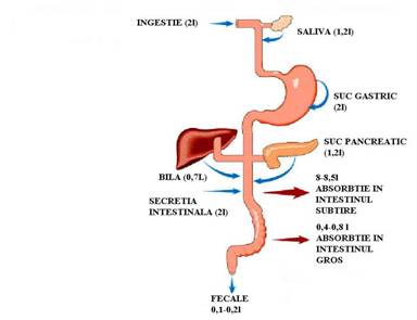 Turnoverul zilnic al apei in tractul gastrointestinal este reprezentat de aportul lichidian de aproximativ 9l/zi (2l din lichidele ingerate si 7l din secretiile digestive) si eliminarea a mai putin de 200ml/zi prin fecale. Deci, apa este absorbita in procent de 98%. Apa este transportata conform legilor osmozei, pentru a realiza izoosmolaritatea chimului cu plasma. Se realizeaza prin porii paracelulari de la nivelul jonctiunilor intercelulare.