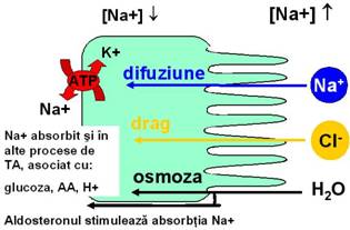 ABSORBTIA SODIULUI Sodiul trece din lumen in enterocit pe baza gradientului electrochimic, iar apoi este pompat activ in spatiile in sange prin zona bazo-laterala a enterocitului. Sodiul este absorbit si in alte procese de transport activ, asociat cu glucide, AA, ioni de hidrogen. Aldosteronul stimuleaza absorbtia intestinala a sodiului, mai ales la nivelul colonului. ABSORBTIA CLORULUI Clorul este absorbit pasiv, secundar absorbtiei sodiului. |
