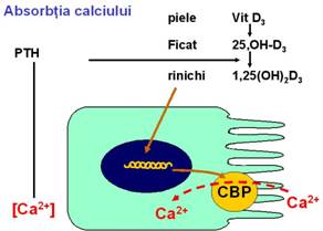 ABSORBTIA CALCIULUI Calciul este absorbit activ prin intermediul unui carrier de la nivelul polului apical CBP (proteina fixatoare de calciu). Sinteza acestei proteine se realizeaza in enterocit si regleaza rata absorbtiei intestinale in functie de controlul exercitat de vitamina D si de parathormon. |