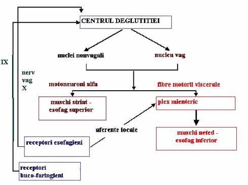 - Propagarea bolului alimentar prin esofag se face cu o viteza variabila in cele 4 portiuni ale esofagului. Viteza este crescuta in regiunea cervicala cu muschi striat, scazuta in regiunea toracica cu muschi striat si neted si foarte scazuta in regiunea abdominala si diafragmatica ce prezinta numai muschi neted.