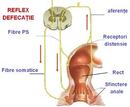 De la centrul ano-spinal al maduvei sacrate (S2-S4), pe calea nervilor pelvici este comandata contractia peristaltica a rectului si relaxarea concomitenta a sfincterului anal intern.