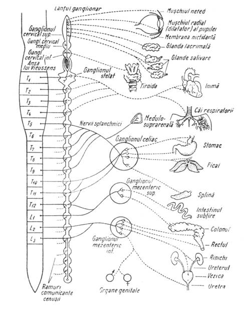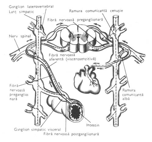 Mentionam ca fibrele preganglionare medulare ies prin radacina anterioara a nervului spinal, impreuna cu fibrele somatice, patrund apoi prin ramul comunicant alb in ganglionul simpatic paravertebral. Aici, fibra preganglionara are mai multe posibilitati: