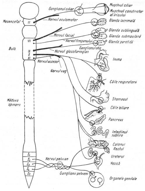In bulb se afla nucleul salivator inferior de unde isi au originea fibrele parasimpatice ale glosofaringianului (IX). Sub planseul ventriculului IV se afla nucleul dorsal al vagului (cardio-pneumo-enteric), de la care pleaca fibre preganglionare direct la: inima, bronhii, plamani, esofag, stomatc, ficat, pancreas, intestinul subtire, colonul ascendent si transvers, splina, rinichi, glandele suprarenale. Nervul vag (pneumogastric), dupa ce formeaza nervul laringian inferior (recurent), ramane numai cu fibre vegetative.