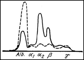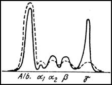 Curba electroforetica in mielomul multiplu ( punctat: ser normal).
